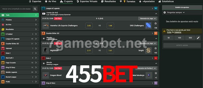 O 455Bet oferece uma grande seleção de opções de apostas em e-sports com probabilidades competitivas